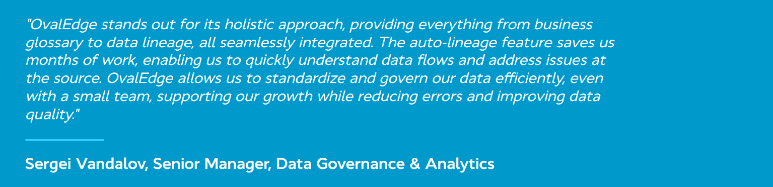 "OvalEdge stands out for its holistic approach, providing everything from business glossary to data lineage, all seamlessly integrated. The auto-lineage feature saves us months of work, enabling us to quickly understand data flows and address issues at the source.”
