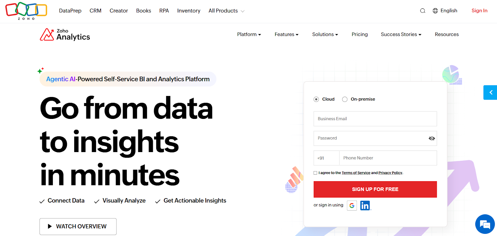 Zoho Analytics is a self-service BI platform with built-in AI for natural language queries and automated insights. It is designed for quick setup and ease of use. The platform targets SMB and mid-market organizations.