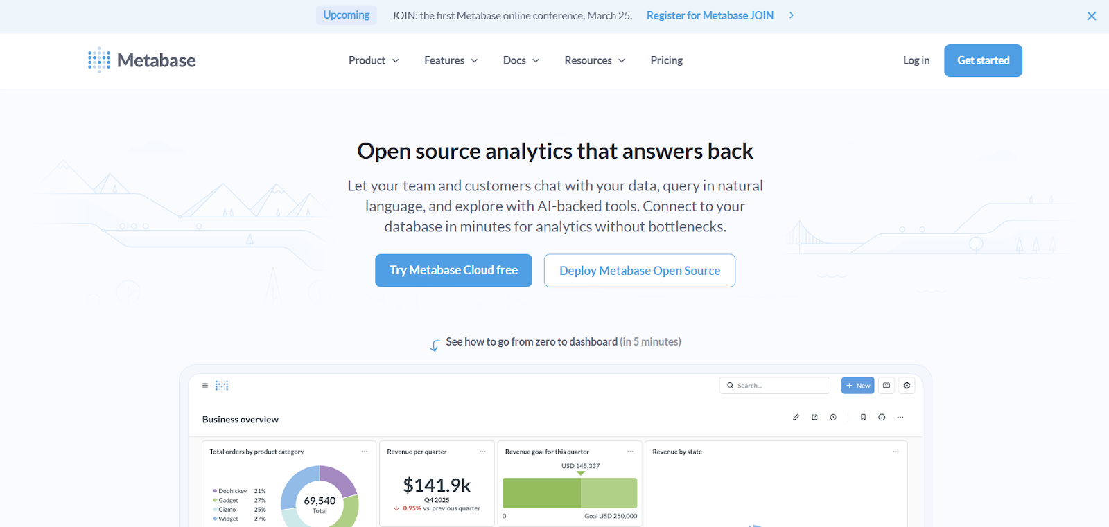 Metabase is a lightweight self-service analytics tool with AI assistance for querying and summarizing data. It prioritizes simplicity and fast adoption. The platform is popular with startups and smaller teams.