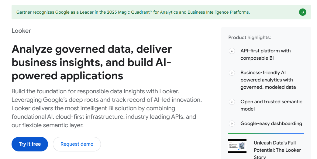 Looker is a cloud-native self-service analytics platform built to deliver consistent insights through a governed semantic model. The platform connects directly to cloud warehouses and generates live queries, which ensures teams always work with current information. It presents data through dashboards, explores, and flexible visual elements that support many analytical needs. Its modeling layer also helps organizations standardize business logic across departments.